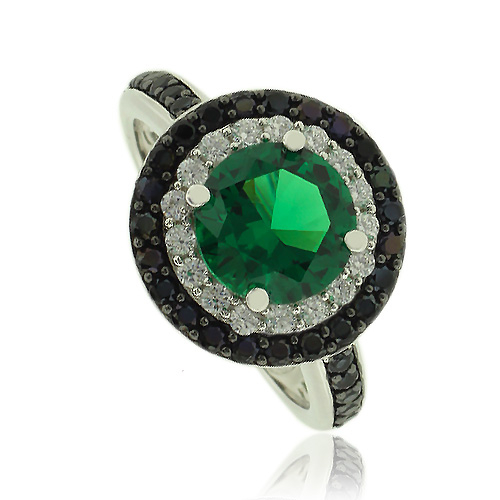 Don't miss the opportunity to have this stunning emerald ring. The contrast of colors make this a special piece of jewerly, a must have. Beautiful Round Cut Emerald Ring With Simulated Diamonds. Add intense glimmer to your outfit with this gorgeous ring with emerald gemstone (in approx. 8mm x 8mm) and simulated Diamonds. Made with .925 sterling silver of the best quality.