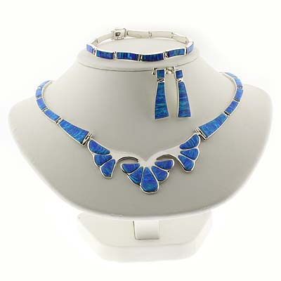 Blue Opal Silver Flower Necklace, Bracelet and Earrings Set The necklace is also made with a better silver .950 it comes with bracelet, earrings and necklace.