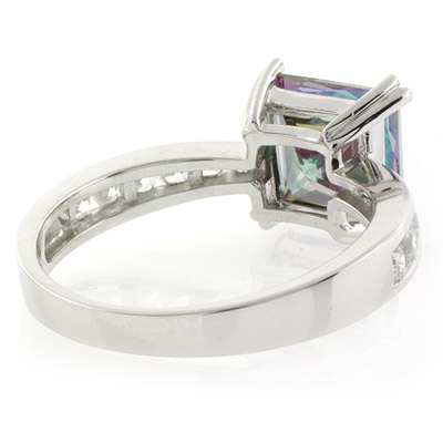 Her love will be completely wiped her feet with this stunning engagement Mystic Topaz ring. Once you look into the eyes of the 12 dazzling simulated diamonds on the band of the ring, to be absolutely sure of the infinite love for her. This Mystic Topaz engagement ring has a 9 mm square cut center alexandrite stone.