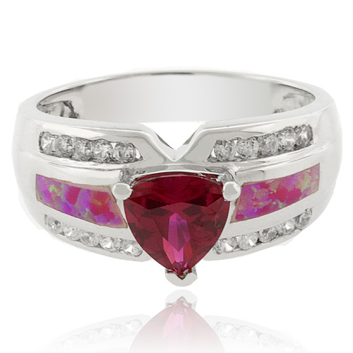 This trillion cut lab-created red ruby and bezel set lab-created pink opal ring is set in sterling silver. Polished to a shine finish, this ring is available in any size. Remember available in all size means, we resize it for you free of charge.