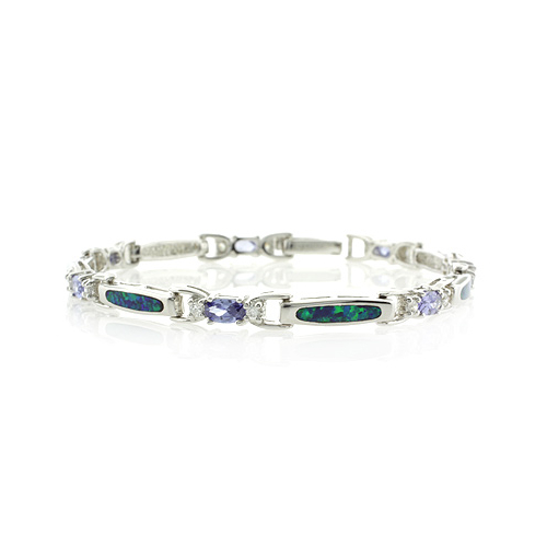 A row of lustrous created opal gemstones and tanzanites give this sterling silver bracelet illuminating beauty. 18 cms (7.1" in)